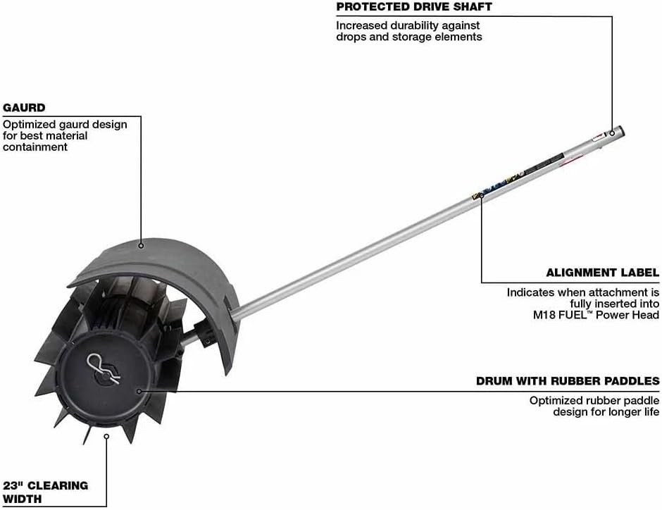 Our M18 Rubber Broom Attachment is powered by the M18 FUEL Power Head w/ QUIK-LOK and is compatible with our M18 FUEL Attachment System. This attachment's optimized rubber paddle design is great for removing debris like mulch and gravel from grass and allows for longer life while covering a 23" clearing width. Our rubber broom's optimized guard design offers the best material containment. Our QUIK-LOK Attachments feature protected drive shafts for increased durability against drops and storage elements. The rubber broom attachment also features optimized gearing to manage the cordless M18 FUEL Power Head RPM output specifically for this attachment.