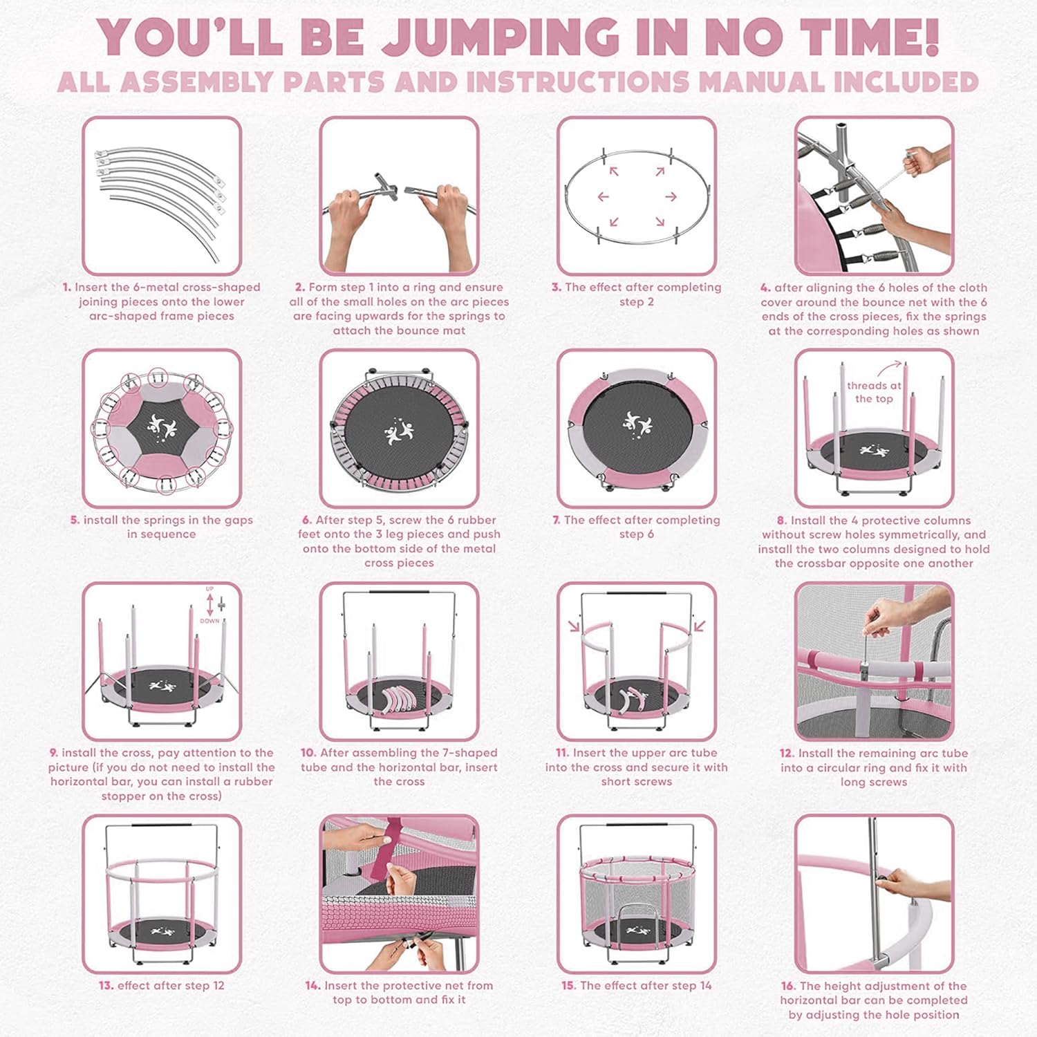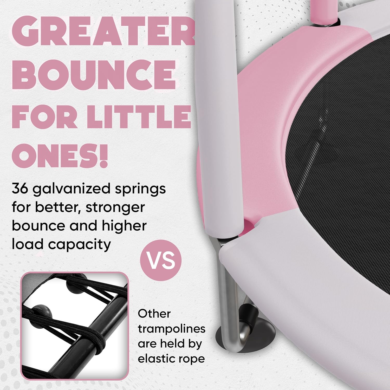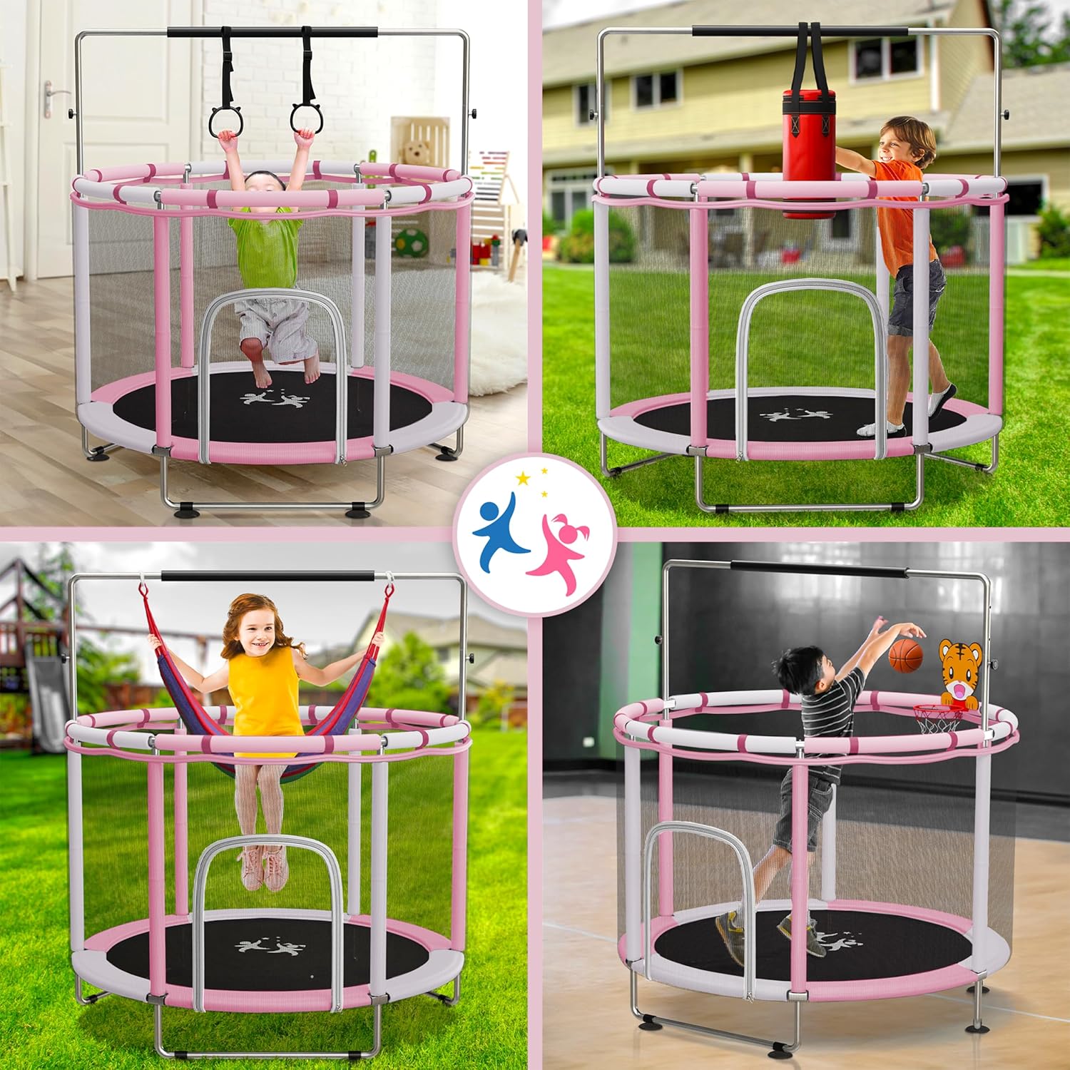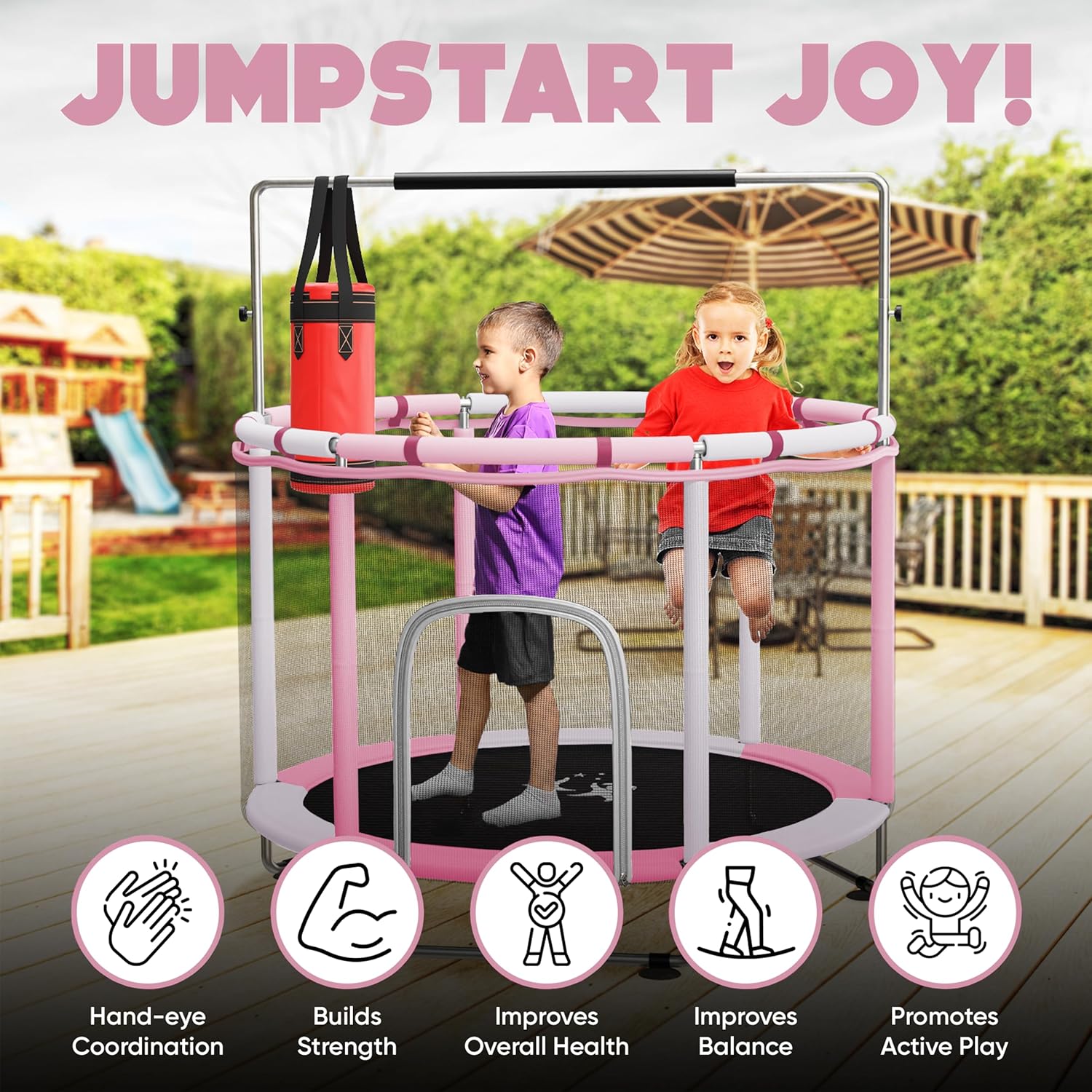 Keep your toddlers active, entertained, and safe with the KickStart Kids Trampoline Indoor and Outdoor Playground!Designed to bring joy to kids and peace of mind to parents, this trampoline toddler is packed with features that ensure hours of fun while promoting physical and mental development.Safety first, fun always! This trampoline indoor kids platform is wrapped in a sturdy safety net, creating a fortress of joy for your kiddos. With a zip-access door, your little jumpers can hop in and out safely. No more worrying about tumbles or spills—our trampolines for kids have their back!Durability? Check! The trampoline for kids 3-6 up to 8 years old comes with a high-quality polypropylene mat that’s comfy and tough. And the galvanized metal frame? It’s as sturdy as they come, ready to face any weather so you can place it in the garden, patio, or backyard.Wobbly toddler indoor trampoline is so yesterday! With our toddler trampolines’ sturdy feet attachments, you’ll have an indoor kids trampoline that will stay put, no matter how wild the jumps get.Why settle for just bouncing when you can have a whole playground? Our trampolines for kids indoor and outdoor play come with a basketball hoop for slam dunks, a boxing bag for mini boxers, gymnastic handles for little acrobats, and colorful ocean balls for sensory fun. Plus, there’s a little trampoline hammock for when they need a little break. It’s a trampoline kids 3-10 years old can play with, ensuring that their total weight and height will not exceed 220 lbs. and 4.5 ft.Our baby trampoline grows as your child does! Thanks to the adjustable kids mini trampoline crossbar, it adapts to your kiddo's height, making sure the fun lasts for years. This trampoline for kids indoor and outdoor play will effortlessly be your child’s favorite hangout spot as they grow up.So let your child bounce, play, and explore in a world designed just for them. Bring home the KickStart Mini Trampoline for Kids by clicking 'ADD TO CART' now!