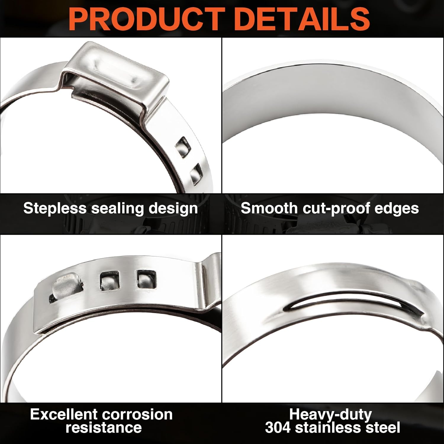 Including: 50 Pcs 5.3-6.5mm, 50 Pcs 6-7mm, 50 Pcs 7-8.7mm, 50 Pcs 7.8-9.5mm, 50 Pcs 8.8-10.5mm, 36 Pcs 9.4-11.9mm, 36 Pcs 10.3-12.8mm, 36 Pcs 10.8-13.3mm, 20 Pcs 12-14.5mm, 20 Pcs 12.8-15.3mm, 20 Pcs 13.7-16.2mm, 20 Pcs 15-17.5mm, 20 Pcs 14.8-18mm, 20 Pcs 15.3-18.5mm, 12 Pcs 16-19.2mm, 12 Pcs 17.8-21mm, 12 Pcs 20.3-23.5mm, 12 Pcs 22.4-25.6mm, 10 Pcs 25.4-28.6mm,/> 9 Pcs 28.4-31.6mm, 8 Pcs 29.9-33.1mm, 7 Pcs 32.9-36.1mm. Tool: 1 Pcs ear clamp plier, 1 Pcs tweezers, 1 Pcs pipe cutting knife.