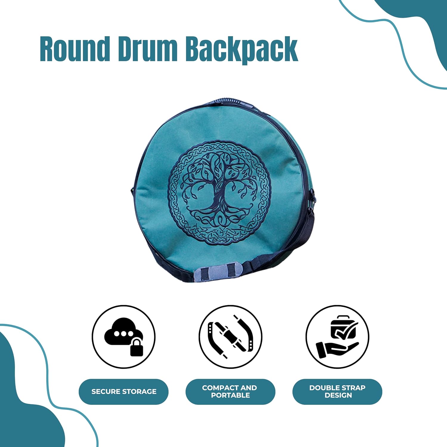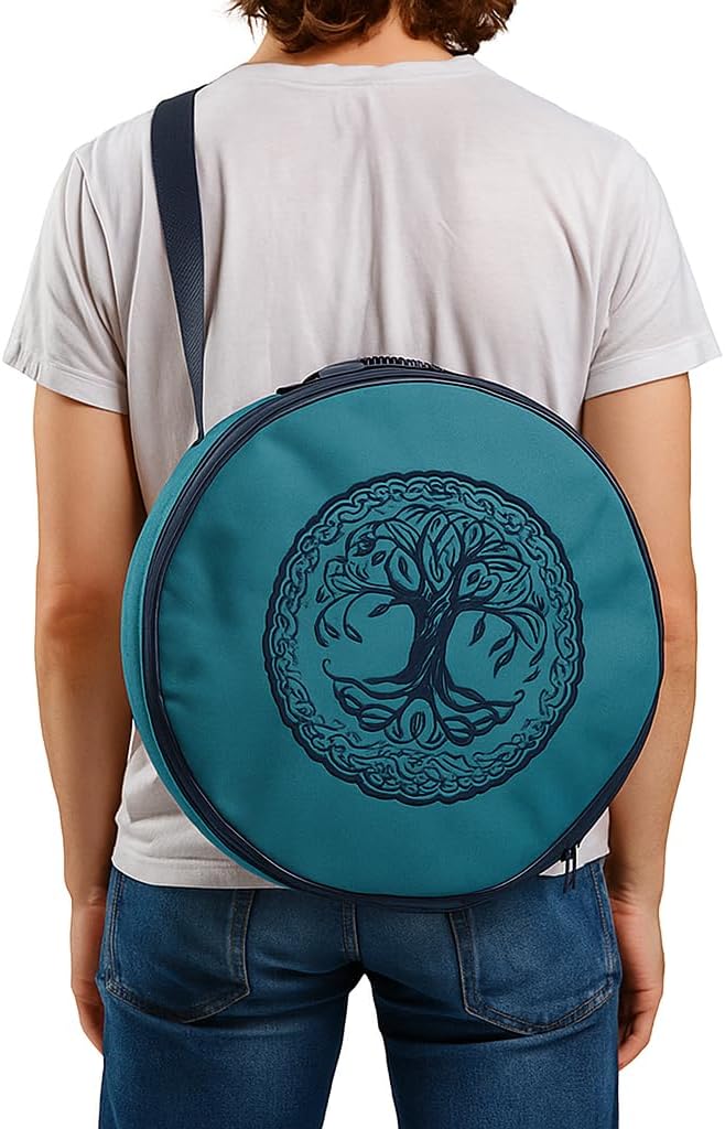 Carry your drum in style with this striking forest green bag featuring an intricate Celtic Tree of Life design. The beautifully embroidered back pattern combines traditional Celtic knotwork with a majestic tree motif, creating a distinctive look for musicians and performers. Measuring 16 and 18 inches in diameter, this versatile bag serves dual purposes - a protective carrier for frame drums and bodhrans, plus a comfortable cushioned seat perfect for festivals and outdoor events. The thoughtfully designed carrying system includes padded adjustable backpack straps and an ergonomic handle for easy transport. Built for lasting performance, the bag features reinforced stitching, heavy-duty zippers, and protective navy trim. The segmented construction maintains the bag's shape while providing convenient storage space with full-length zipper access. Weighing just 2 pounds, this universal design offers ample padding to protect your instrument during transport. Whether you're heading to performances, practice sessions, or festivals, this drum bag combines practical functionality with Celtic-inspired artistry.