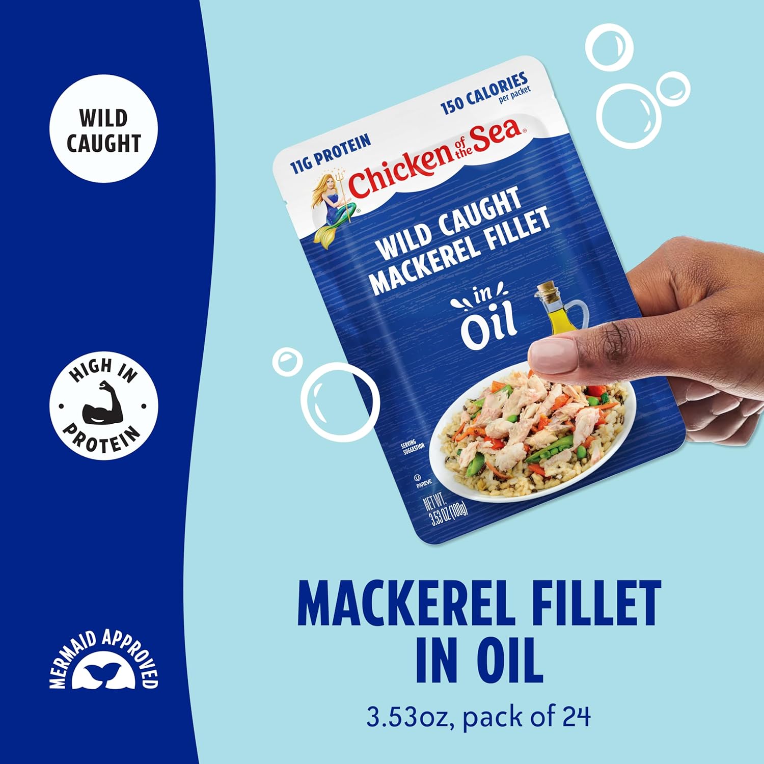 Product Description 100% SIMPLE INGREDIENTS: Chicken of the Sea Mackerel in Oil packets contain only premium cuts of wild caught mackerel perfectly seasoned with salt and packed in soybean oil for a rich, delicious flavor. It is also gluten-free with no preservatives. CONVENIENT AND VERSATILE: We put the delicious flavor and fantastic nutrition of wild caught mackerel in a convenient, portable packet. With no can opener required, our mackerel packets are equally at home in your pantry or your lunchbox. HEALTHY LIFESTYLE FUEL: Mackerel is packed with protein, omega-3s, and rich, savory flavor, so it’ll turn even the simplest dish into a scrumptious meal and is an ideal addition to keto, paleo, and Mediterranean diets, or any healthy lifestyle. WILD CAUGHT: Chicken of the Sea is proud to offer only responsibly sourced, high quality, wild caught mackerel. We’re leading the charge to ensure that our seas are sustainable now and for future generations. BULK 24 PACK: Buy your mackerel in bulk and save! Each order contains (24) 3.53-ounce pouches so you can stock up. Add a packet to your next salad or rice bowl, or grab a fork and dig right in anywhere your healthy lifestyle takes you. Manufacturer Contact Information PO Box 308, Mt Olive, NJ 07828