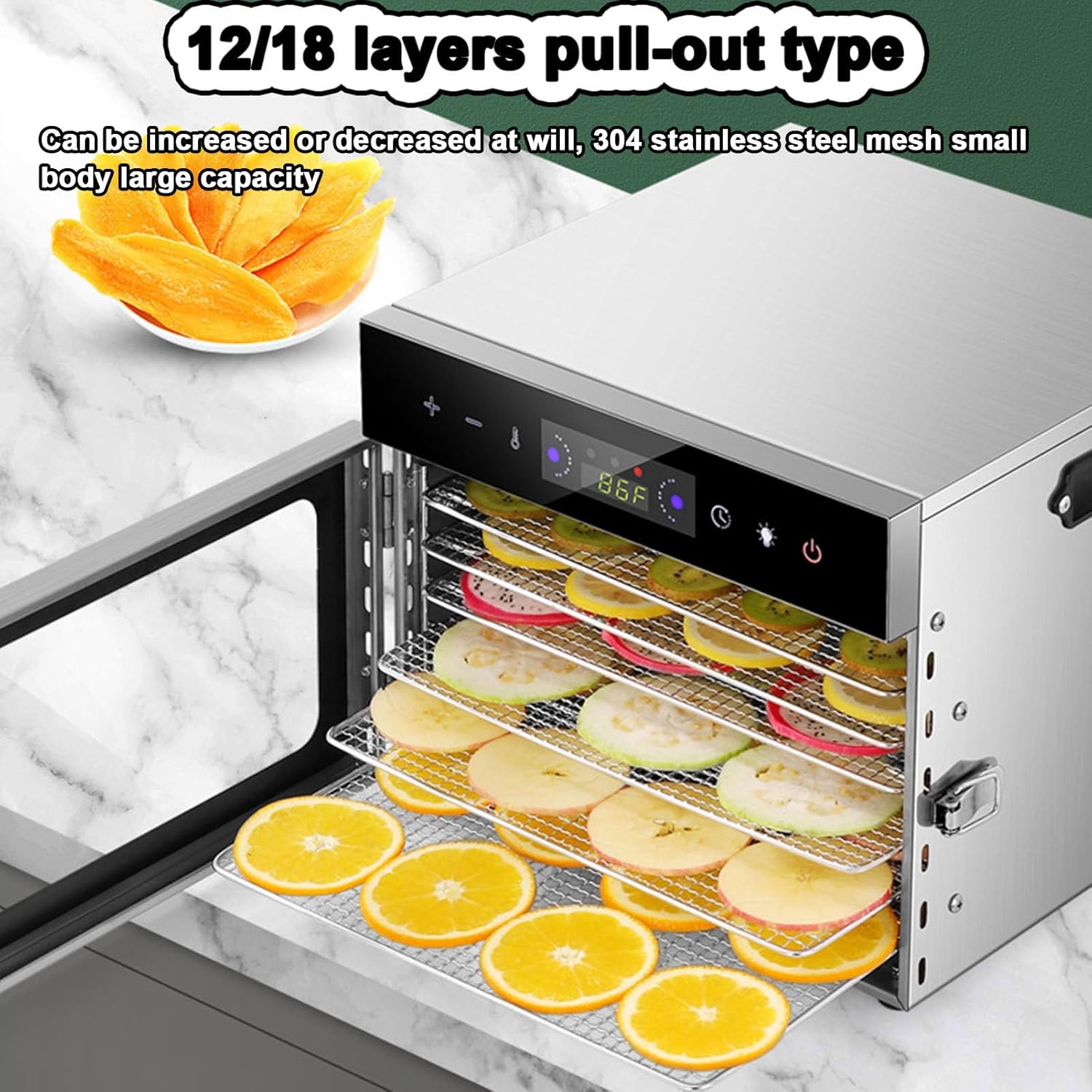 ** - Name: Freeze Dryer/Freeze Dried Machine - Material: 304 Stainless Steel + Tempered Glass - Rated Power: 800W - Rated -50Hz - Hours Setting Range: 1-24 Hours - Temperature Setting Range: 30-95°C - Grid Size: 280*200mm - Dimensions: 18 Layers: 31×30×55.5 cm **Package Includes:** - 1 x Food Dehydrator