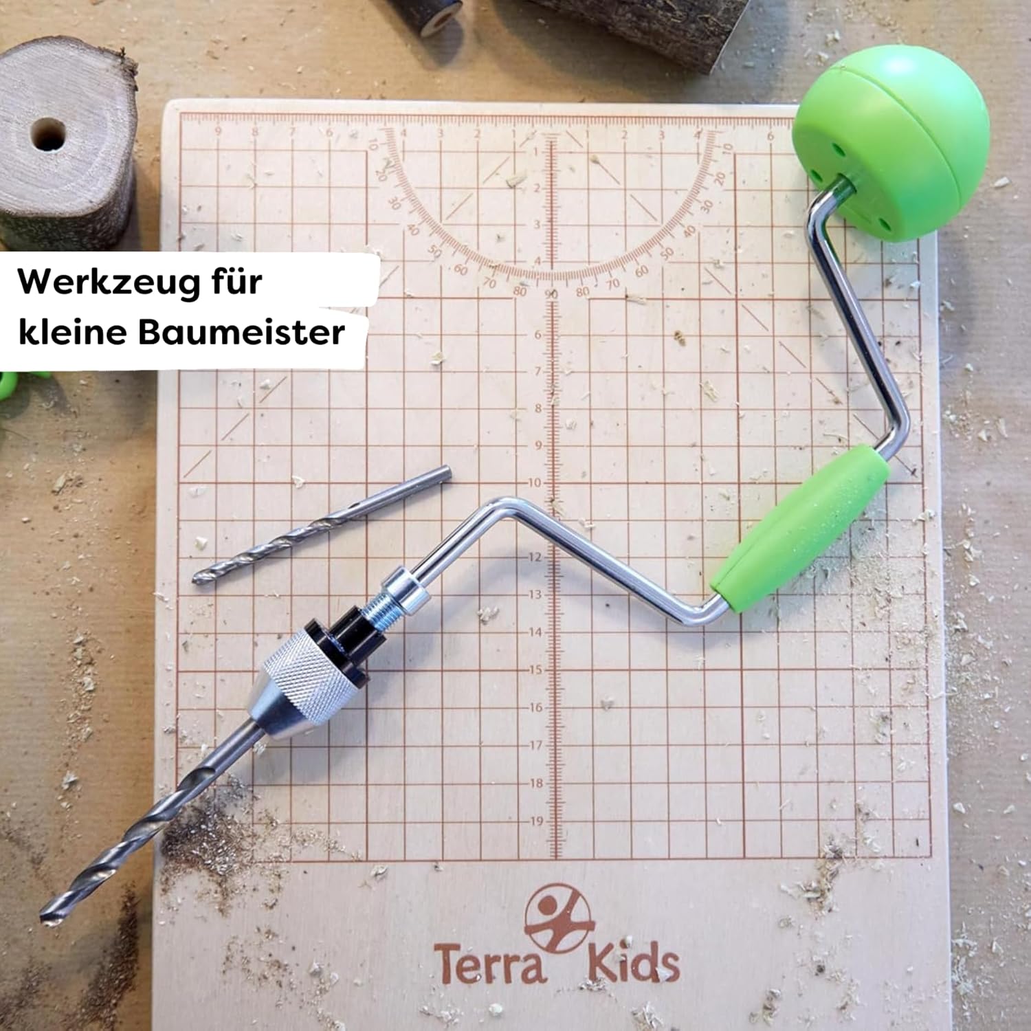 Attach and crank - with the Terra Kids drill winch from HABA you can drill precise holes in branches, wood scraps, corks with little effort - for DIY projects or to build HABA Terra Kids connectors. The children's drill winch is a real tool for working on all types of wood and - like all Terra Kids tools - the HABA drill winch is optimally adapted to children's hands in size, weight and ergonomics. With the own drill winch from HABA children will be enthusiastic about the correct handling of tools. The set includes 2 drill bits with different diameters. These are easy to replace in the drill chuck for sustainable DIY fun with HABA.