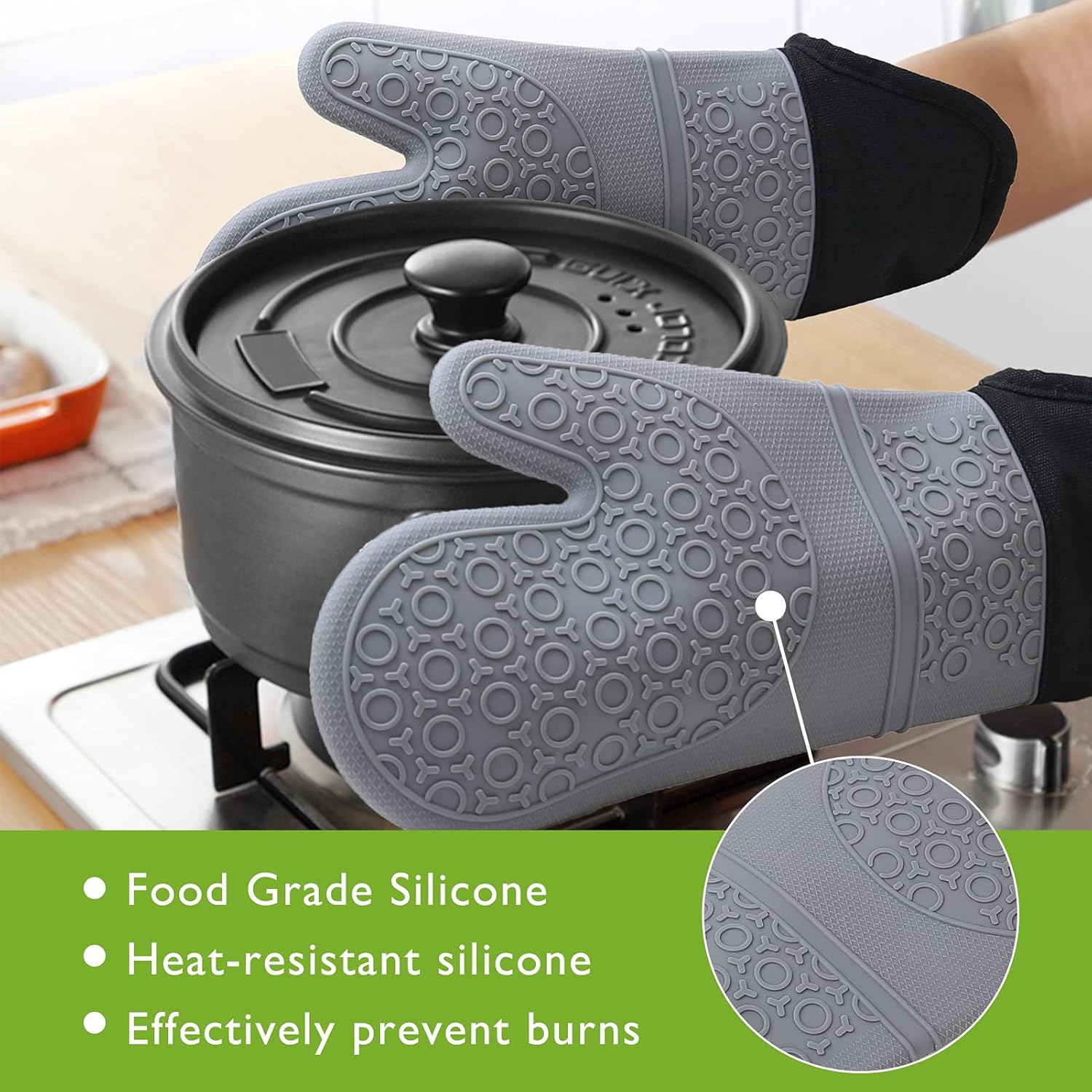 Sturdy & Comfortable Our pot holders and oven mitts sets are made of BPA free food grade silicone which is heat resistant and harmless to people. Premium Fiber Cotton Unlike other oven mitts using recycled cotton, our mitt's quilted liner is made of premium natural cotton. our silicone mitts with features of durable, non-toxic, heat-resistant, stain-resistant. High Quality Qulited Liner Our cooking mitts are ultra soft, breathable and comfortable which can offer you good protection and comfortable touch. Specification: oven mitts Size:15*7 inch. pinch mitts Size: 4.1*3.3 inch silicone Pads Size: 7*7*0.27 inch Note: 1. Do not higher than 446℉ temperature to use the oven mitts. 2. Do not Sharp Weapon to use the products. 3. Do not Fire on the products. 4. Do not dishwasher wash the products. 5.If the mitts getting hot in High temperature, please after cooling few minutes to use. Package include: Oven Mitts * 2pcs Pinch mitts * 2pcs Silicone pads * 2pcs