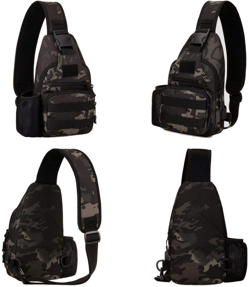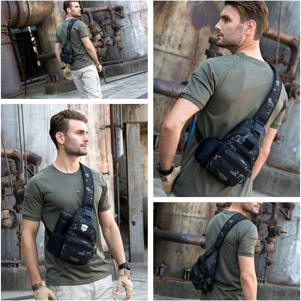 Huntvp Small Tactical Sling Chest Pack Bag Molle Daypack Backpack iPad Mini Military Shoulder Bag Crossbody Duty Gear for Hunting Camping Trekking Department:Unisex Structure 1.Exterior: One main pocket, Two zipped front pocket, One Interlayer , One side pocket 2.Interior: One open pocket 3.Outer Material: High strength abrasion nylon Inner Material: Waterproof Silky Cotton 4.Back: Thicken Breathable Sponge 5.Hardware: Metal+Lengthen the Rope Pull Head 6.Adjustable Long Shoulder Strap: Military Nylon Fabrics Nondetachable Shoulder Strap Measurements 1.Dimensions: 6.3"W x 11.8"H x 4.3"D Side Pockets: 5.5"H x 2.8"W 2.Shoulder Strap length: approx. 27.6”-47.2" Shoulder Strap Width: 2.8” Side bottle pocket diameter: approx. 2" 3.Weight: 0.88lb Features 1.Suitable for Trekking,Hiking Climbing,Campers and other outdoor activities. 2.Chest sliding adjustment system can quickly adjust to their comfortable state,so that more comfortable Backpack. 3.MOLLE external expansion system designed to be used in combination with other equipment,you can load pockets,water bottle bag,accessory kits and other. 4.The bag works well with a variety of different outfits and casual styles. Notes 1.Care:Hand wash with cold water. 2.Tolerance:0.39"-0.79" 3.Packing List:Tactical bag x 1.