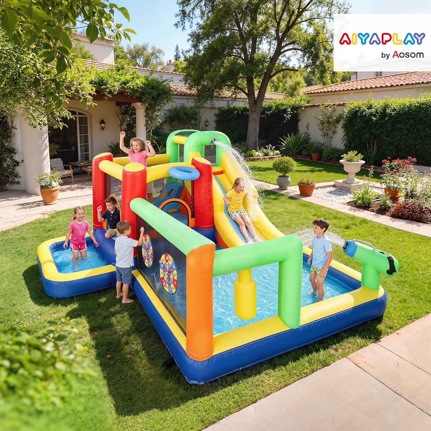 This 9-in-1 water bouncy castle is designed for children to enjoy a wide and varied play space at home. It combines jumping, sliding, climbing and two pool or ball type areas, which can freely adapt to the type of play. Made with reinforced Oxford fabric in key areas, it offers a stable structure for daily use. Ideal for keeping children active and entertained for hours, always under adult supervision. Features: ● This inflatable water park offers 9 play activities in a single structure for a varied experience ● Allows use with water or dry depending on the type of fun you prefer ● Incorporates two pool or ball type zones for multiple ways of playing ● Includes safety net around the jumping area ● 550W blower allows quick and easy inflation ● Important Note: We do not ship to the Canary Islands, Ceuta and Melilla, or to the Azores and other islands of Portugal Specifications: ● Color: multicolor ● Material: 420D Oxford cloth and 840D Oxford cloth ● Overall dimensions: 330 x 290 x 185 cm (LxWxH). ● Trampoline dimensions: 123 x 105 x 36 cm (LxWxH). ● Slide measurements: 180 x 88 x 100 cm (LxWxH). ● Pool area measures: 182 x 158 x 25 cm and 105 x 55 x 25 cm ● Climbing wall measurements: 65 x 65 cm (width x height). ● Maximum load: 120 kg ● Recommended Age: 3-8 Years ● Approved age: +3 years ● Blower power: 550W ● Input voltage: 220-240 V / 50 Hz. ● Meets standards: EN71-1-2-3, EN71-8 ● Reference: 346-028V90MX ● 1 x Bouncy Castle ● 1 x Electric blower ● 9 x Felt Ball ● 2 x Small Basketball ● 11 x Fixing Stake ● 12 x Repair Patch ● 1 x Storage Bag ● 1 x Instruction Manual