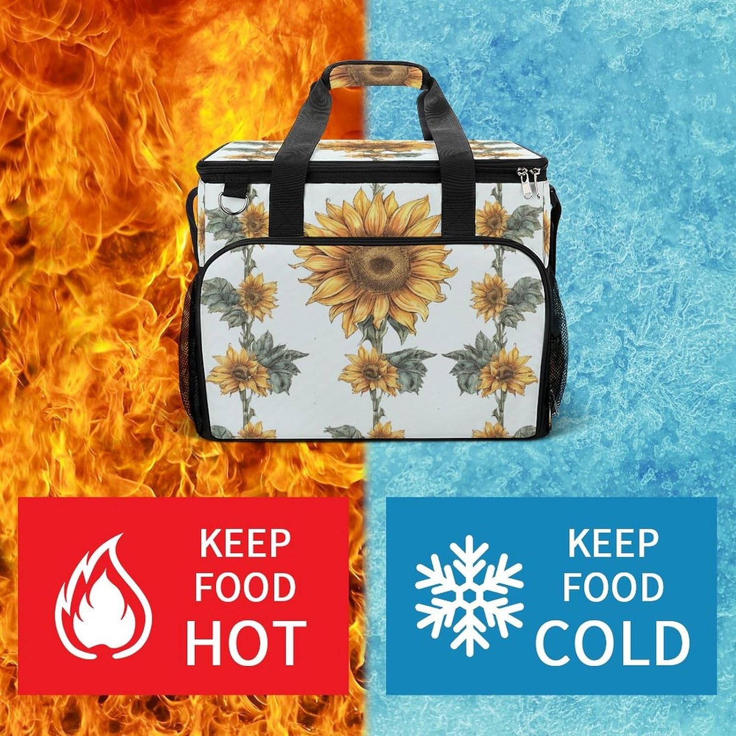Our Sunflower Hand Painted Floral camping ice pack of sturdy Oxford cloth, which is waterproof and durable. The multi-layer insulation structure is carefully designed inside, which has a significant heat preservation and cold preservation effect, which can keep ice drinks cool for a long time and hot food warm. The large capacity is enough to accommodate a variety of camping food and drinks. The comfortable handle and adjustable shoulder strap are convenient for carrying or carrying. The multi-pocket design on the outside is convenient for storing scattered small items. Oxford cloth is easy to clean and can be restored to cleanliness with simple treatment after use. Whether it is camping, picnic or outdoor party, it is your practical and considerate companion, easily meeting your refrigeration and heat preservation needs.