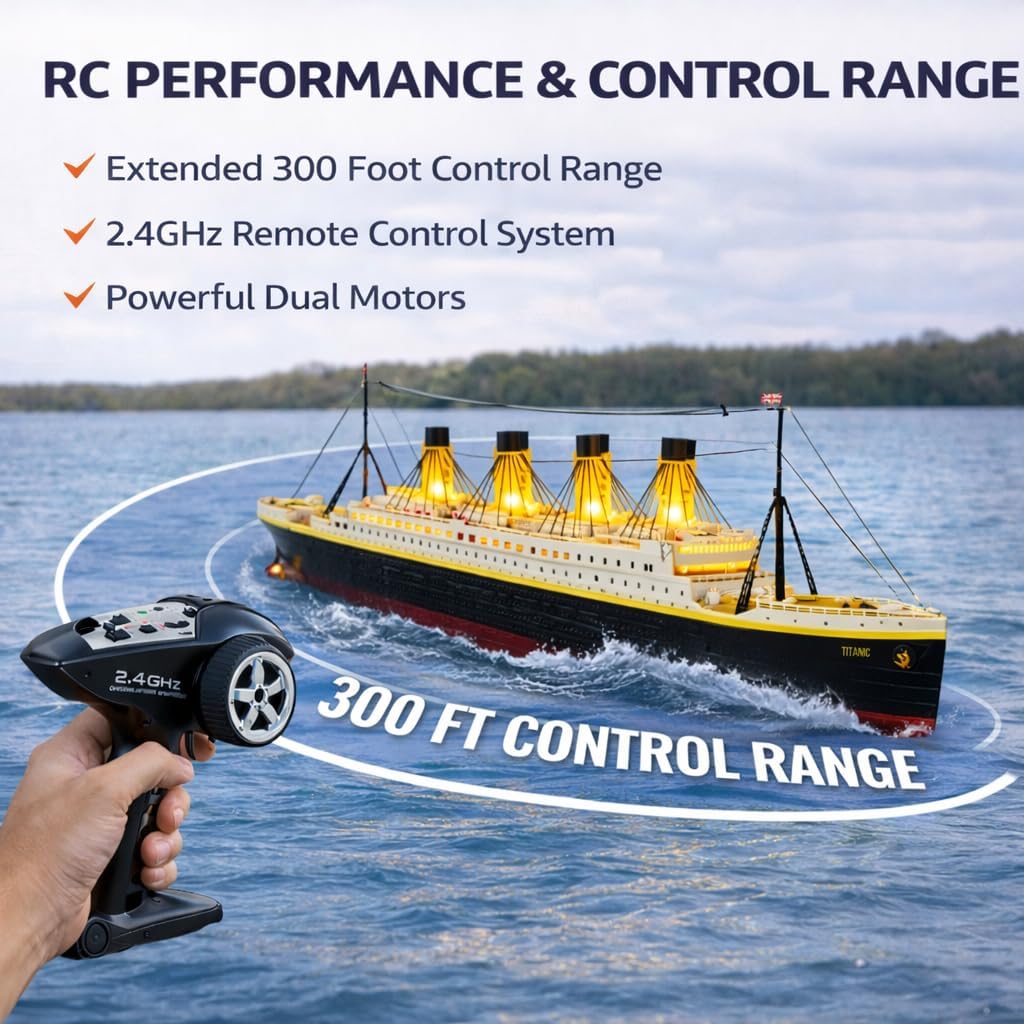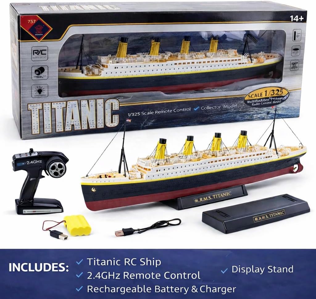 Bring maritime history to life with this large 1/325 scale RC Titanic boat, a stunning thirty two inch remote control cruise ship inspired by the legendary R.M.S. Titanic, the famous White Star Line ocean liner often called the Ship of Dreams. Designed for both water operation and display, this highly detailed model ship features a realistic deck layout, four funnel superstructure, lifeboats, railings, and a glossy exterior finish that captures the elegance of a grand early twentieth century passenger liner. Warm LED cabin and deck lights add a dramatic glow for evening cruising or shelf display, making it a true centerpiece for collectors. The 2.4GHz remote control system delivers stable long range performance with smooth forward, reverse, and steering, allowing multiple RC boats to run together in pools, ponds, lakes, and calm water environments. Powered by an electric motor and rechargeable battery, this ready to run RC boat is easy to operate for beginners while still satisfying experienced hobbyists. Built from durable ABS with a sealed internal electronics compartment, the hull is designed for reliable water use and long term display quality. Whether you are a history enthusiast, model ship collector, or searching for a unique gift, this large scale Titanic RC boat offers an exciting blend of realism, performance, and timeless maritime appeal.