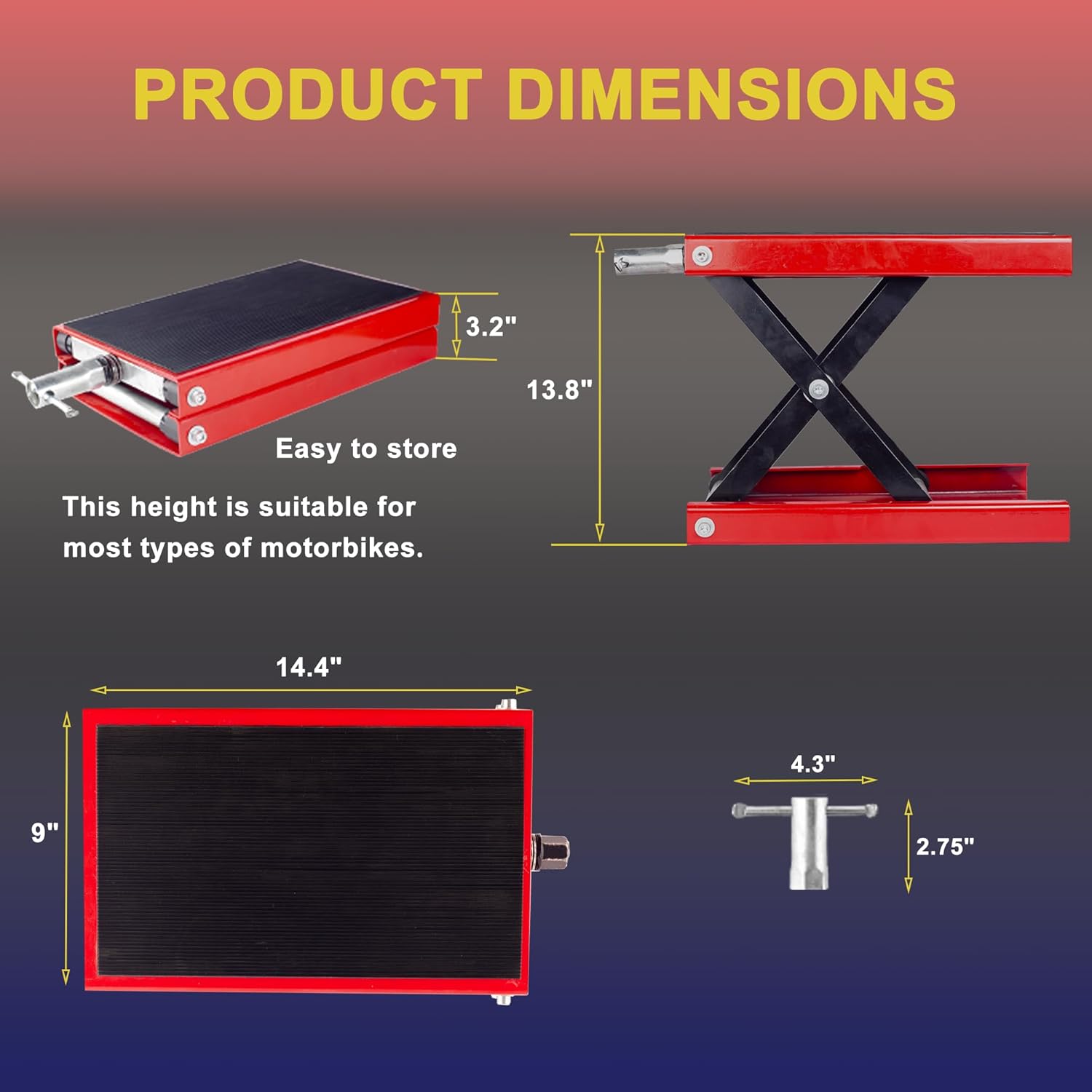 When you are facing motorbike repair problems, this Motorcycle lift scissor jack can solve a lot of your worries. ★Functionality The Scissor lift jack is powerful. It has a weight capacity of 1100 lbs to lift your motorbike with ease. It also lifts your motorbike to the most comfortable working height between 3.5‘-14.5’ for easy motorbike repair and maintenance. ★Stable & Safe scissor lift is equipped with 14"x 9" extra wide top platform on top, which provides a large contact area between the motorbike and the lift. This allows for stable lifting and lowering of the motorbike. Durable rubber mats with a striped pattern prevent slipping and protect your motorbike from scratches. ★Wide Application Most motorbike models including Street Bikes, Cruiser Bikes, Touring Motorcycles, etc. can be mounted on this jack. Compact design saves a lot of space. After use, you can place the stand in narrow and compact spaces, such as lockers, corners, wardrobes, garages, etc. This scissor lift jack is easy to ues. Easily lift your motorbike without additional tools. Simply turn the removable metal handle to effortlessly lift your motorbike jack. The paint coating is resistant to oil, grease and rust, making it easier to clean up after repairs. The sturdy scissor shape and black and red colour scheme enhance the beauty of motorcycle jack.