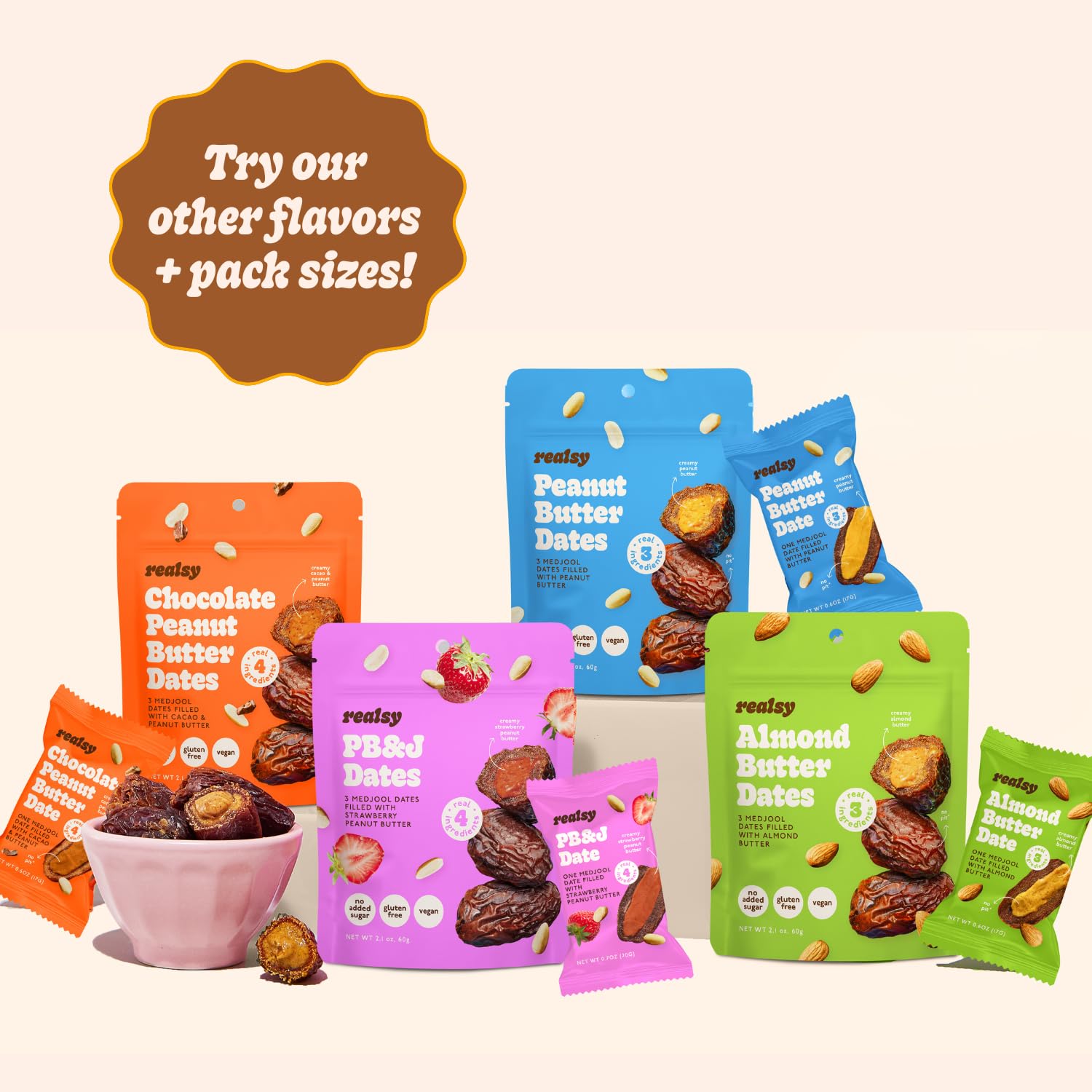 ON-THE-GO SNACK: Get 5 packs of dates with each pouch containing 3 dates filled with strawberry peanut butter. Our dates are pitted with simple ingredients to keep you healthy. Enjoy our dates in convenient packaging, perfect for on the go!