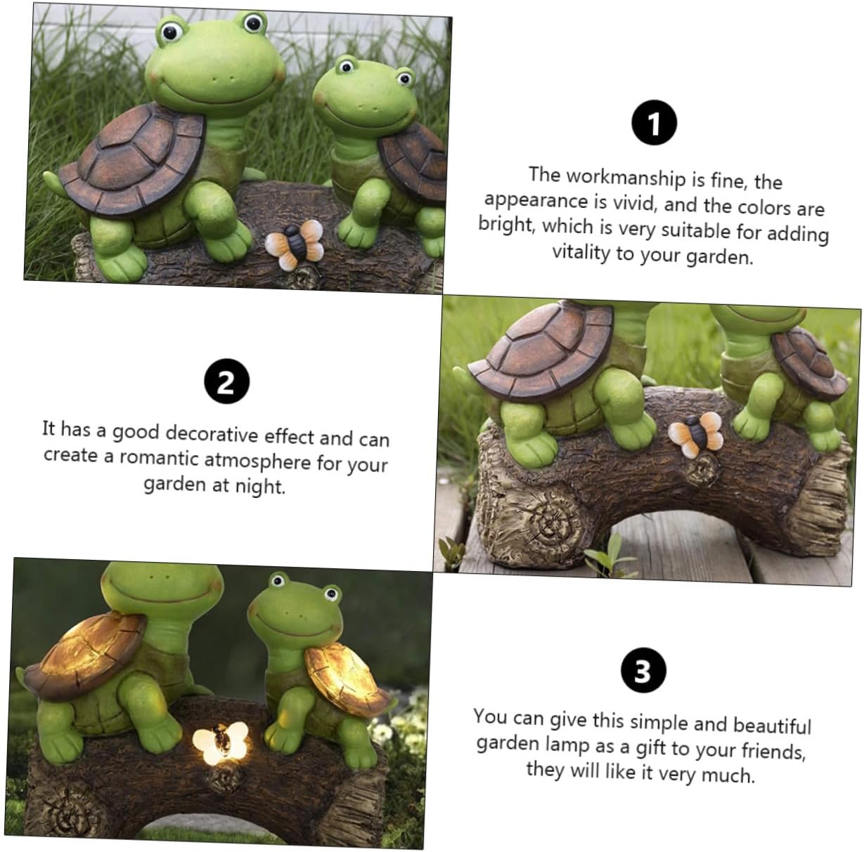 Package Include 1 lamp Features -Color: Green decoration light. -Size: About 24.00X12.00X21.50cm/9.43X4.72X8.45inch resin night light. -Material: Resin patio decorations outdoor. -Preferred materials, , , and turtle light for yard decor. -The design is unique, and it is a decorative ornament and lighting garden lamp outside decorations. -You can this beautiful and garden decorative light at an yard decorations. -The light is natural and gentle, lighting you, you can use it with landscape light outdoor. -Fine workmanship, high efficiency, , and convenient, will be your outside decor.Goods Informationpatio decor turtle The creative and interesting design will bring you a better decorative effect.outside decorations This product is a garden decorative lamp made of resin materials, which is gardens, terraces, yards, lawns, etc.garden decor for outside This is a very good decorative lamp that will bring you a good experience.outdoor figurine absorbs sunlight during the day to store electrical energy and lights up at night