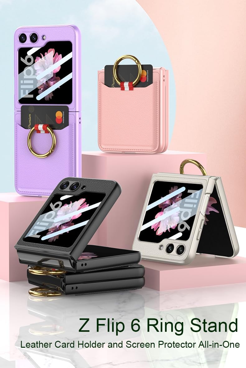 SHIEID upholds the concept of providing the high quality products and customer first, and provide customers with the best quality products and services. SHIEID Galaxy Z Flip 6 Case with Ring Stand and Card Holder - Slim Leather Wallet Cover for Samsung Z Flip 6 with Built-in Screen Protector for Galaxy Z Flip6 Phone Case Key Features: SLIM AND STYLISH DESIGN:This for Samsung Galaxy Z Flip 6 case features a slim and sleek profile that adds minimal bulk while providing reliable protection. The sophisticated appearance complements the Galaxy Z Flip 6's design perfectly. PERFECT FIT: Precision cutouts allow easy access to all ports, speakers, and cameras. The simple snap-on shell installation includes a built-in screen protector for effortless use without interference. This Z Flip 6 case supports wireless fast charging, making it convenient to charge your device. RING HOLDER:The upgraded metallic gold ring provides a secure and comfortable grip, making your phone easier to hold. It can also be attached to a keyring or belt buckle, adding versatility. The slim leather enhances your phone’s style and makes a bold statement. CARD HOLDER: This multi-purpose Z Flip 6 wallet case allows you to carry your cards, cash, and ID securely and easily. It’s more than just a case – it's a sleek, functional wallet for your Galaxy Z Flip 6. ALL-AROUND PROTECTION: The durable PU leather exterior and hard polycarbonate interior of this Flip Z 6 case provide double the protection. It safeguards your phone against drops and bumps and ensures it is safely lifted from flat surfaces.