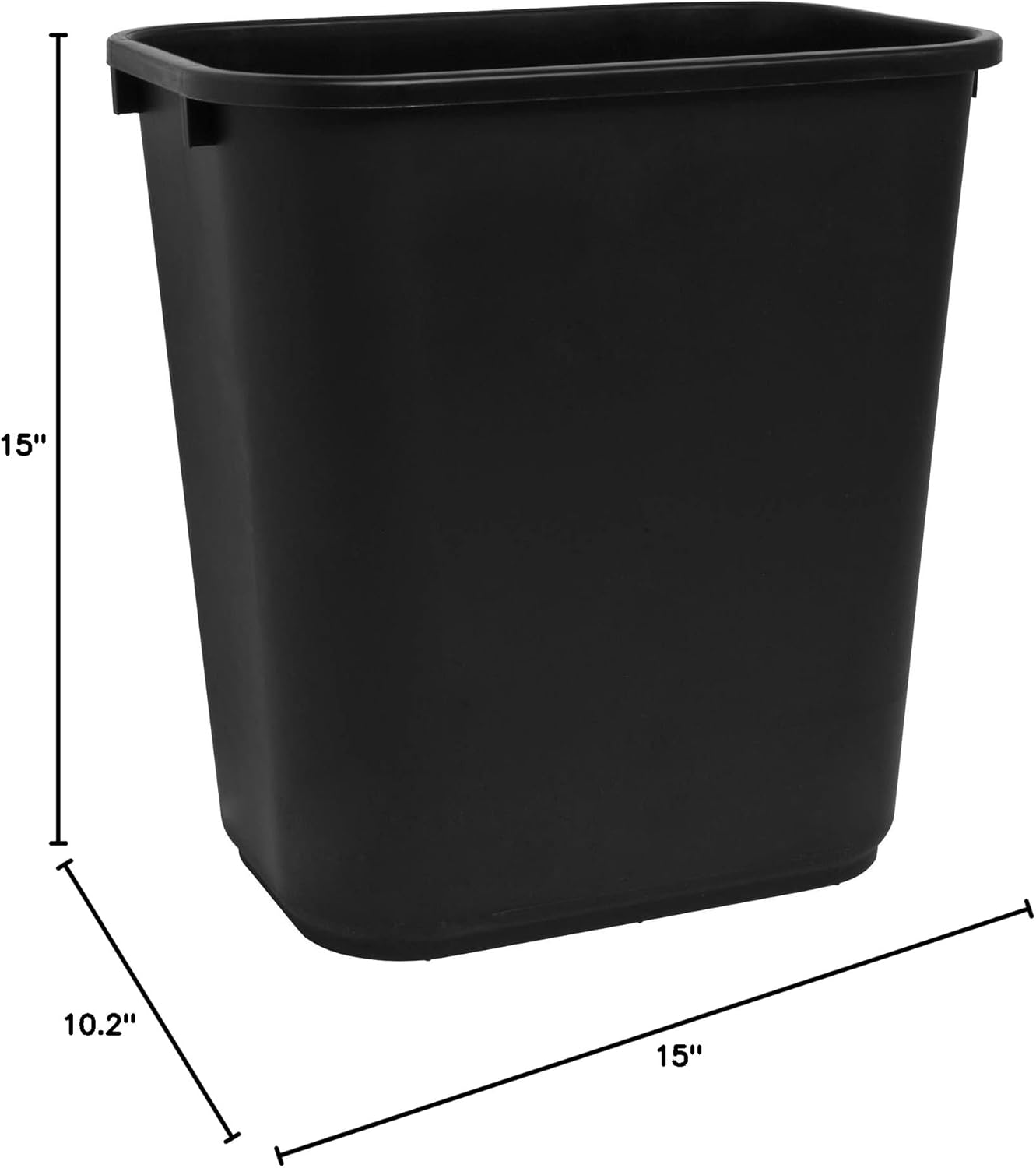 Rectangular wastebasket is made of durable, linear, low-density polyethylene. Functional, easy-to-clean wastebasket holds 28 quarts. Packaged Quantity: 1 EachProduct Type: WastebasketCapacity: 7 galShape: RectangularMaterial: PolyethyleneColor: BlackDimensions: 15" Height x 14. 50" Width x 10. 50" DepthRecycled: NoRecycled Content: 0%Post-consumer-waste%: 0%Assembly Required: No