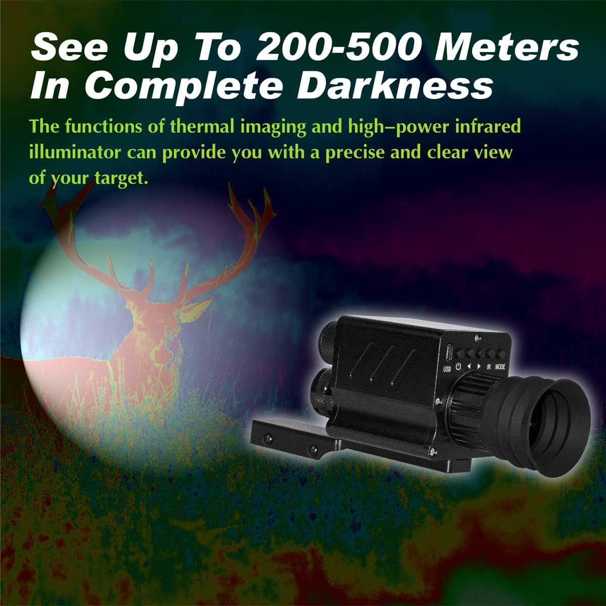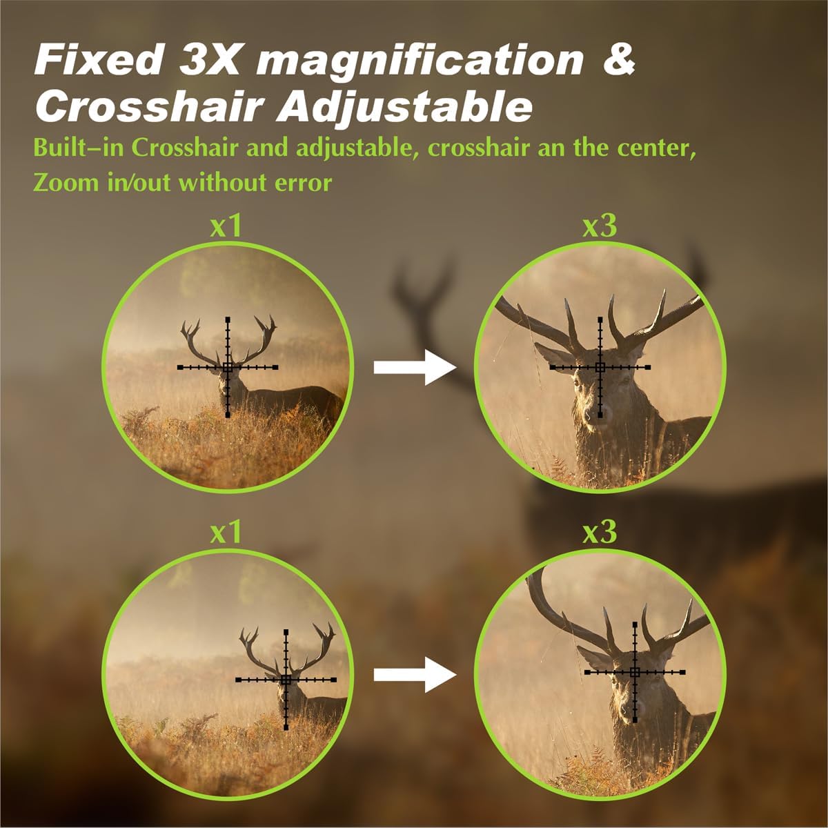 integrates day vision, night vision, and thermal imaging into one. Made of 6061 aluminum alloy, it features a built-in 1.5-inch high-definition AMOLED screen, an 850nm infrared illuminator, a fixed 3X magnification, a crosshair reticle, and a built-in 2600mAh lithium battery.