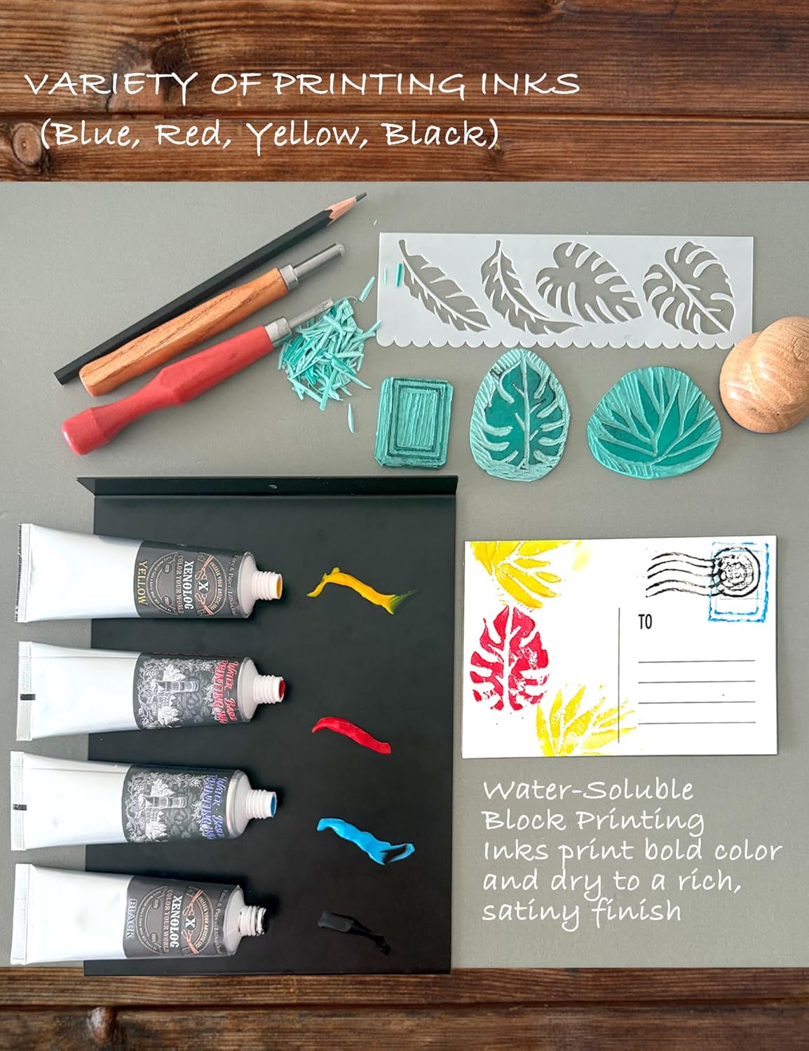 | Included Components | 1.69 ounce (50cc) water-soluble block printing ink in four colors, Brayer, Bench Hook / Inking Plate, 4 lino cutting tools,, baren, linocut block, End-Grain Basswood Block, 5 graphite transfer paper, 3 postcards blank, Stencils for Painting, pencil, manual |